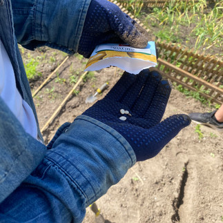 „Im Teamprojekt „Go Green im Schulgarten“ von Herr Grünenbaum und Frau Fiedler haben wir ein Beet in vier Teile unterteilt. Da bauen wir Kartoffeln, Knoblauch, Erbsen, Radieschen und Möhren an. Zudem haben wir Tomatenpflanzen gezogen. Heute pflanzen wir Kürbisse ein.“